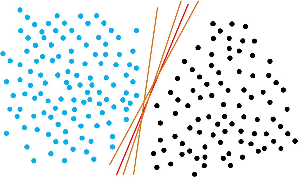 再次观察图2,可以知道,在这个二维平面中,可以把两类点的分开的直线有很多条,如图4所示,那么这些直线中,哪一条才是最好的呢?也就是如何选择出一条最好的直线呢?