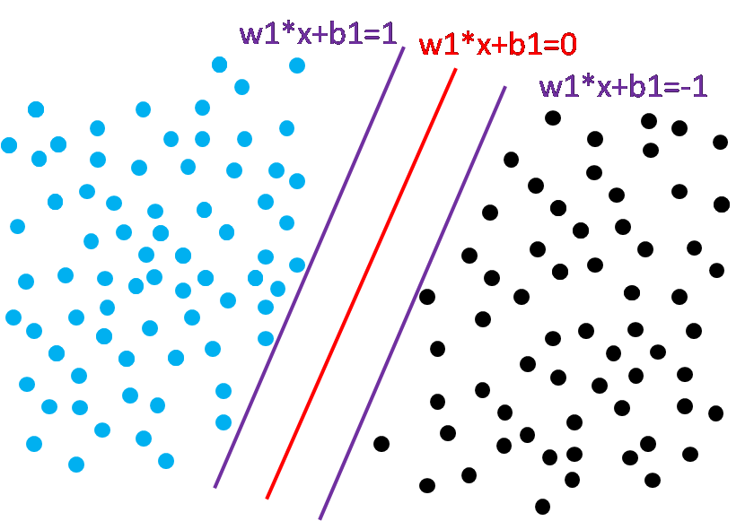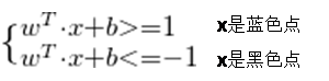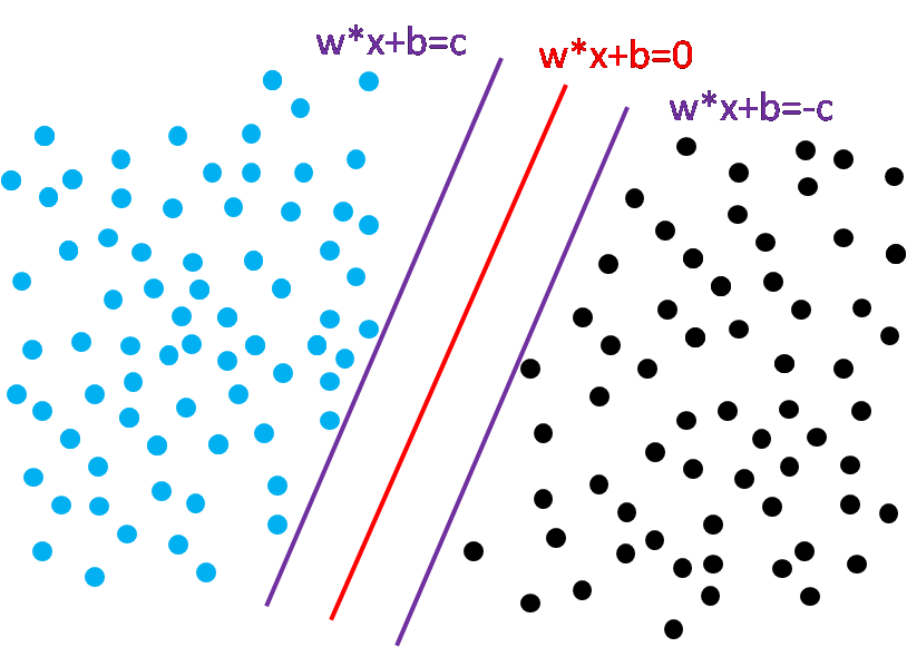 如图5,我们作两条直线,和分类直线平行,让这两条直线分别经过下面蓝色和黑色集合的边界,同时,满足这两条直线到中间分类直线的距离相等,那么,我们可以假定这两条直线方程分别是wx+b=c, wx+b=-c。