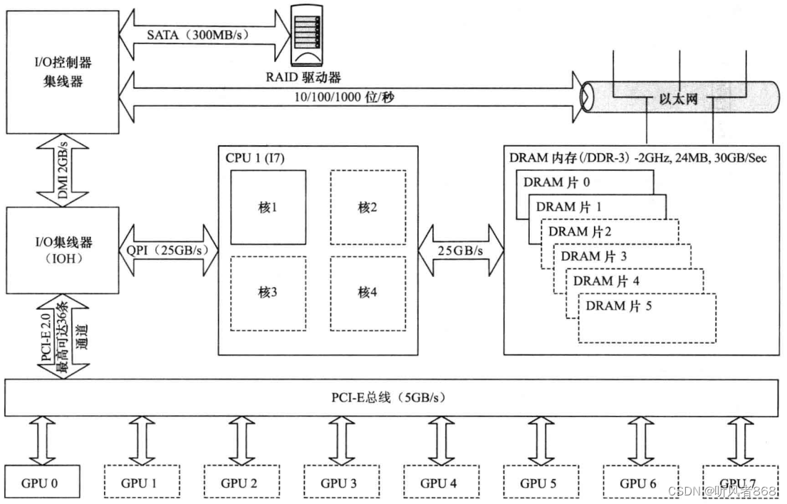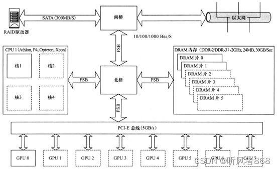 如果使用集群系统中常用的MPI(MessagePassingInterface)作为通信软件,像图 3-1这样将以太网(Ethernet)接口连接到南桥芯片而不是PCI-E总线,构成的通信延迟是很大的。因此,诸如InfniBand这样的专用高速互连设备或者10千兆位(Gigabit)以太网卡常常连接到PCI-E总线上。不过,这就占用了原本可用于GPU的总线插槽。之前,并没有直接用于GPU的MPI接口函数。这类系统的所有通信都需要经过PCI-E总线连通到CPU,然后再原路返回。CUDA4.0SDK提供的GPU直连(GPU-Direct)技术就解决了这个问题。借助 SDK的支持,InfniBand卡就可以直接与GPU通信,而无须先经过CPU转发。SDK中的这项升级还支持GPU与GPU的直接通信。