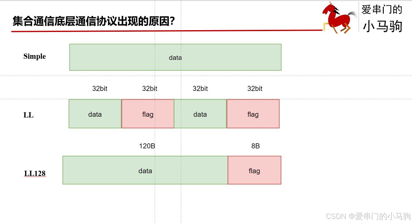 LL:L(ow)L(atency)协议优化NCCL小数据量传输,小数据量情况下,打不满传输带宽时,优化点同步带来的延迟。低延迟,8字节原子存储(LL):提供低延迟的通信,原子存储操作使用8字节。