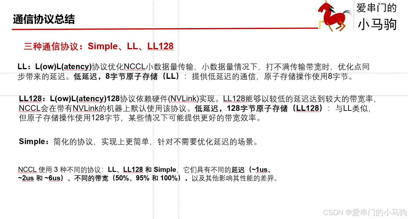 LL128:L(ow)L(atency)128协议依赖硬件(NVLink)实现。LL128能够以较低的延迟达到较大的带宽率,NCCL会在带有NVLink的机器上默认使用该协议。低延迟,128字节原子存储(LL128):与LL类似,但原子存储操作使用128字节,某些情况下可能提供更好的带宽效率。