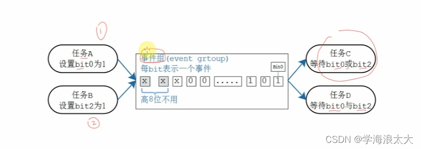 RTOS事件组 假如每一个任务做一件事,事件组就是当任务A执行了或者任务B执行了,就去执行任务C。或是,但任务B和任务A执行了采取执行任务D。而任务B或者任务A里面的东西是我自己决定的(比如当我设定按键1按下才将bit0置1)事件组结构体,用来给任务C和D等待某些事件的,任务AB不需要等待。事件组的等待机制:a、关闭调度器b、当前uxEventBits是否满足,满足就执行相应事件;不满足的话,返回err或者休眠,休眠就将自己放入xTasksWaitingForBits这个链表,然后改变状态()...