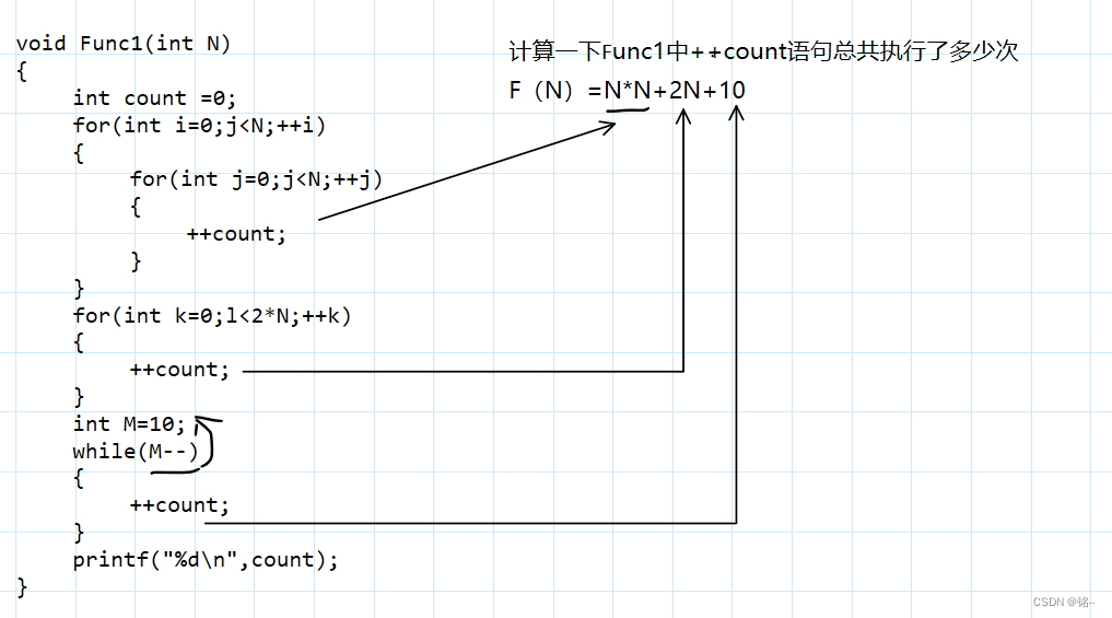 【数据结构】算法时间复杂度和空间复杂度 衡量一个算法的好坏一般是从时间和空间上来衡量的,即时间复杂度和空间复杂度,时间复杂度是衡量一个算法的运行快慢,而空间复杂度主要是衡量一个算法所需要的额外的空间,当前计算机的存储容量已经达到了很高的程度,所以我们一般不再关注一个算法的空间复杂度,算法的时间复杂度是一个函数(数学中的函数)定量的描述算法的运行时间,一个算法所耗费的时间与其中语句执行的次数成正比例,第一个for循环执行N次,第二个for循环执行M次,计算出的时间复杂度应该是N+M,算法中的基本操作的执行次数为算法的时间复杂度。