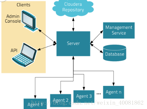 ClouderaManager(本文以下简称为CM)则是为了便于在集群中进行Hadoop等大数据处理相关的服务安装和监控管理的组件,对集群中主机、Hadoop、Hive、Spark等服务的安装配置管理做了极大简化。架构图如图1所示。