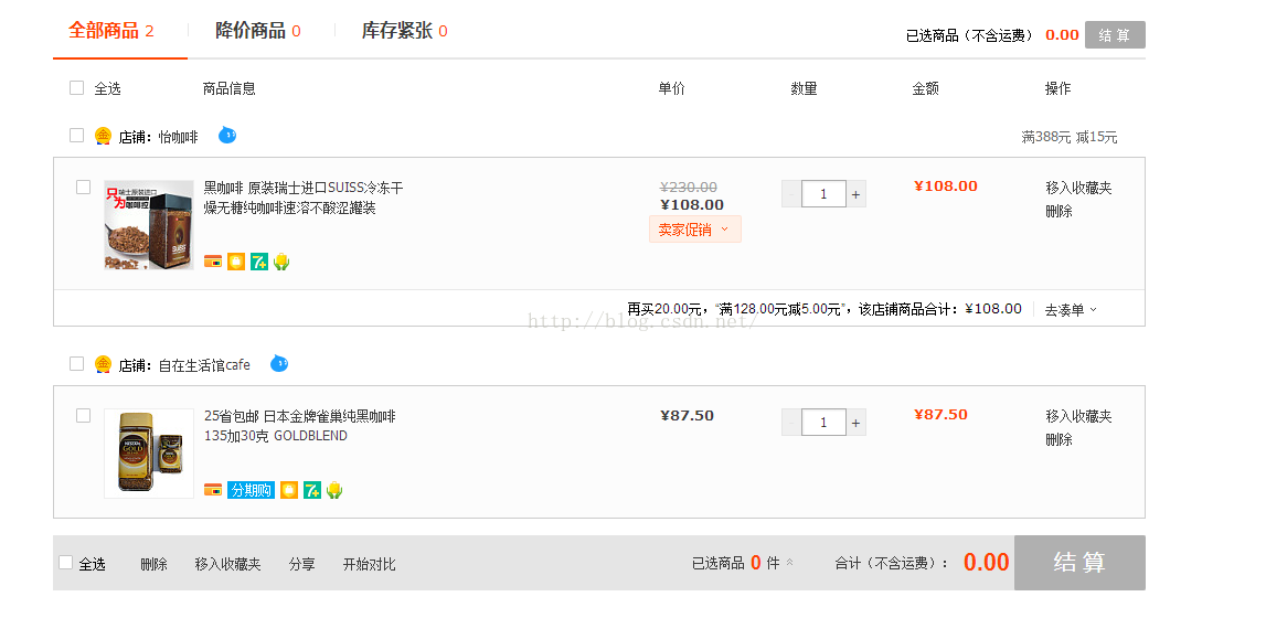 既然是做模仿淘宝购物车,肯定要先去分析一下淘宝的购物车页面,自己去淘宝卖了两件东西,看了下效果;