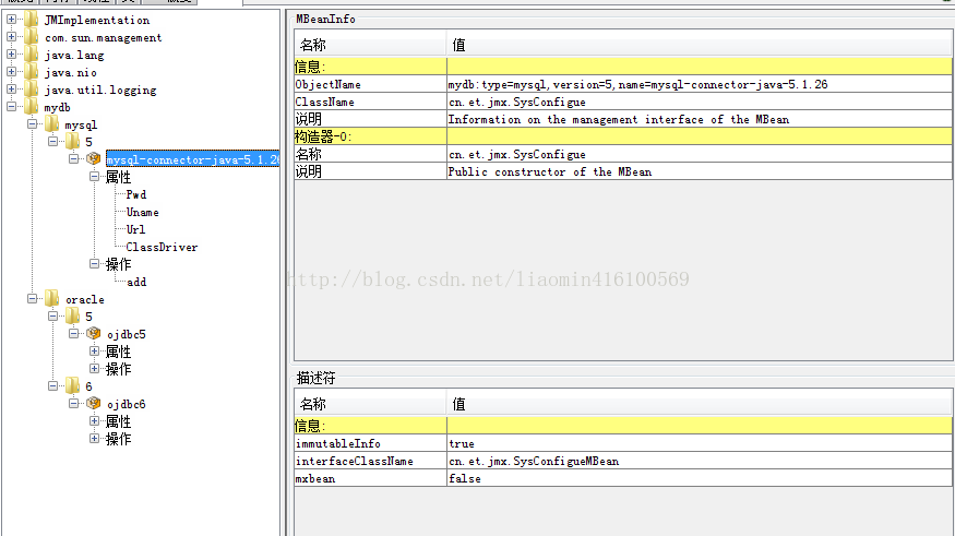 ObjectName mysqlName = new ObjectName("mydb:type=mysql,version=5,name=mysql-connector-java-5.1.26");//中间必须有个:后面的必须是个键值对 类如abc:test=test