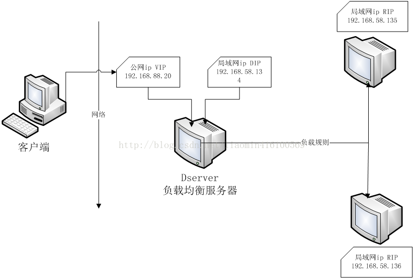 转发服务器需要定义个路由规则 将发送的数据包 转换为 源ip 客户端ip 目标ip是 后端的Rserver的Rip 才能正常的被后端机器收 后端Rserver返回结果后