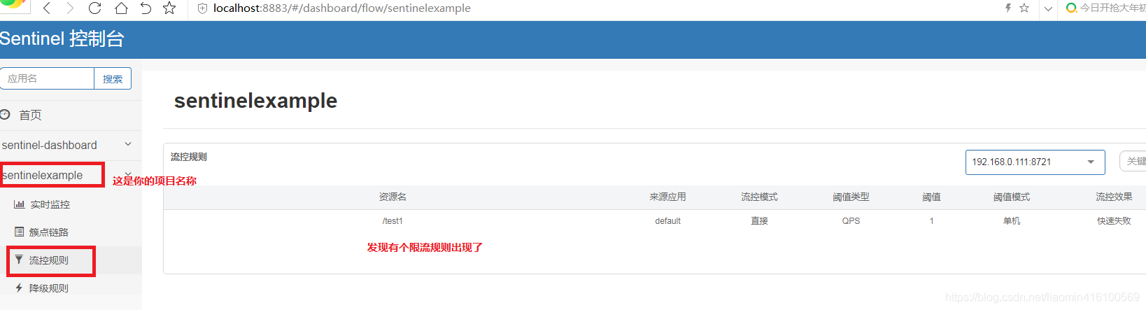 在浏览器上执行这个设置规则的路径 http://localhost:8082/setTest1FlowRule 回到sentinel控制台,查看是否有当前项目的监控项