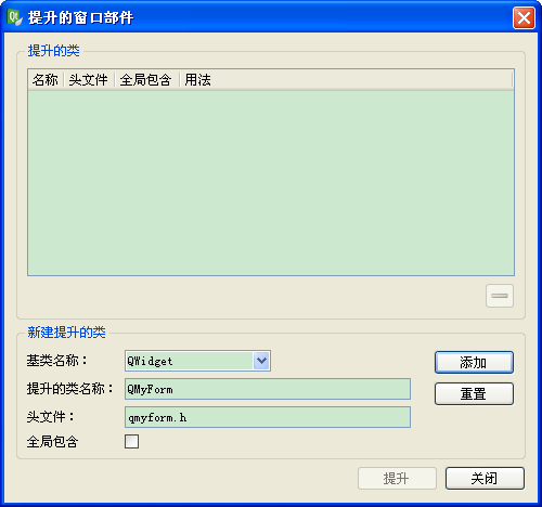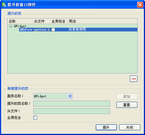 3、手动输入提升的类名“QMyForm”,然后点击按钮“添加”