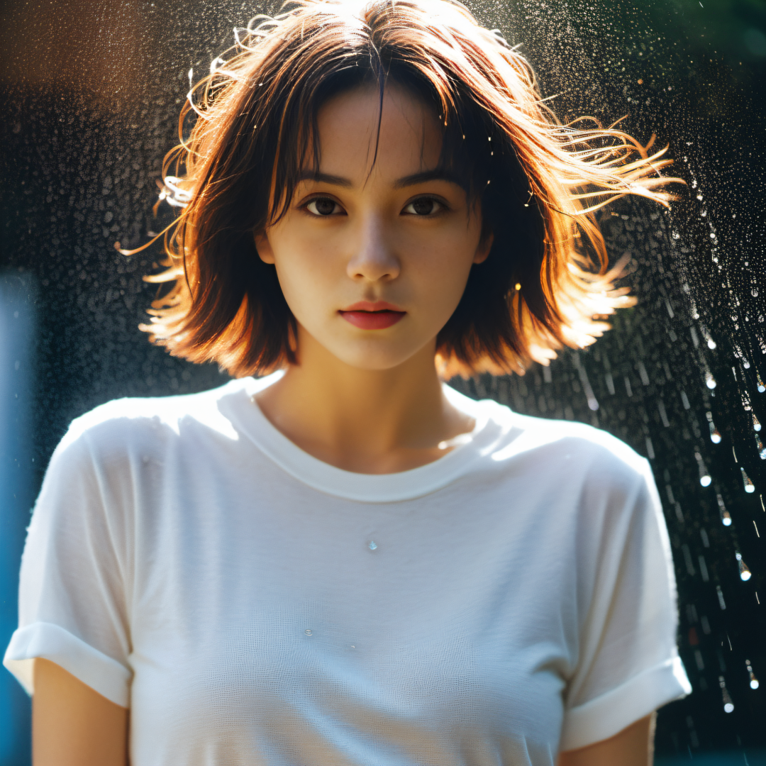 提示词:1girl,湿T恤水滴,飞溅细节,超现实戏剧性光影,(lofi,模拟,柯达胶片)由Brandon Woelfel Ryan McGinley,