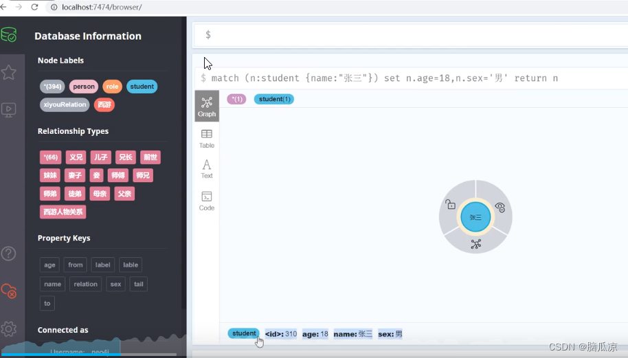 match (n:student {name:"张三"}) set n.age=18,n.sex='男' return n