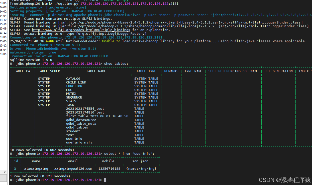 0: jdbc:phoenix:172.19.126.120,172.19.126.121> select * from "userinfo";