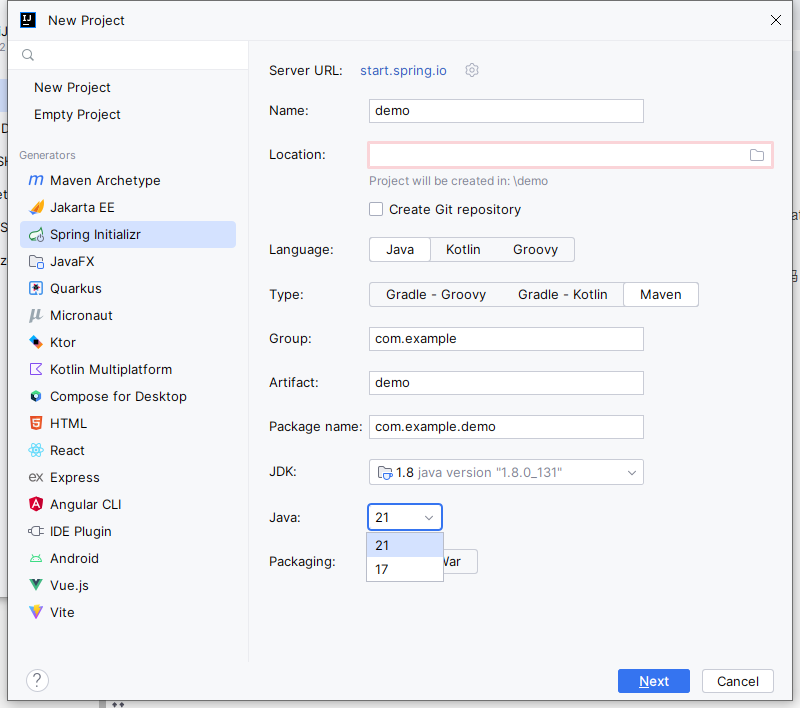 采用JDK17或者21版本,创建项目后,springboot的版本要改为3.0以下,在pom.xml中把java改为1.8,如下图