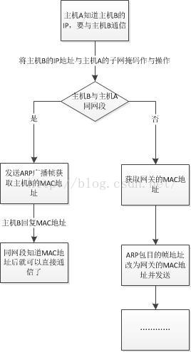 如流程图上右边的分支,因为是不同网段,主机A认定需要通过路由才能找到主机B,所以先找网关MAC,把arp广播包发给网关,再由网关去转发...(以下省略1000字);