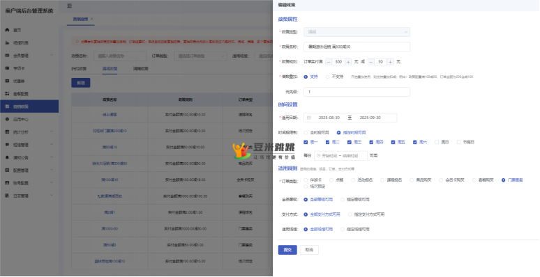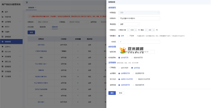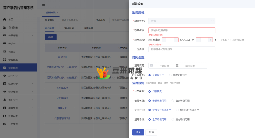 豆米跳跳智慧场馆系统的商户端为管理者提供了多类型营销政策的配置模板,包含门票折扣、满减和满赠政策。系统支持优惠券与营销政策叠加使用,灵活满足多样化促销需求。