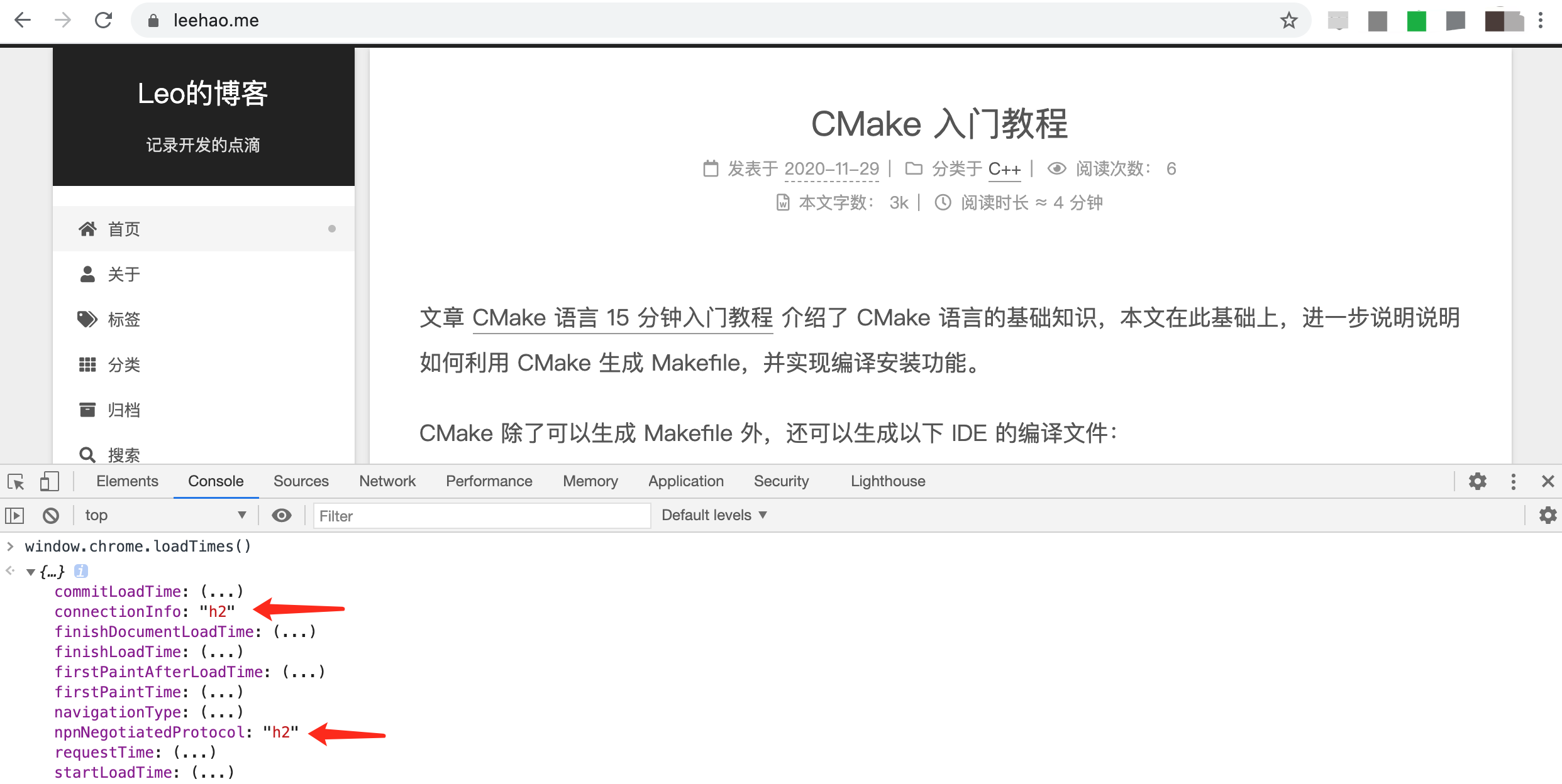然后查看 connectionInfo 和 npnNegotiatedProtocol 的值,如果为 H2,即说明网站已支持 HTTP/2,如图所示: