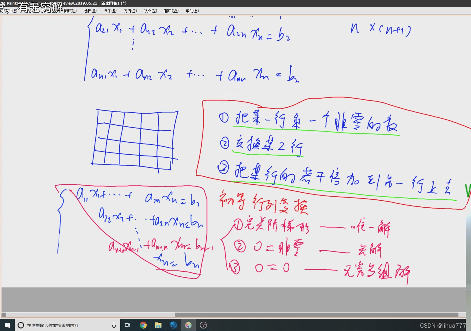 - 有唯一解:若在最后化成的上三角形矩阵中,不存在正对角线中某个元素为0,此时矩阵有唯一解