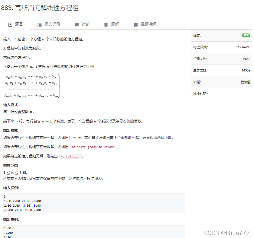 - 有无数解:若在最后化成的上三角形矩阵中,存在正对角线中某个元素为0,且其所在行的最后一列元素也为0时,此时矩阵有无穷组解、