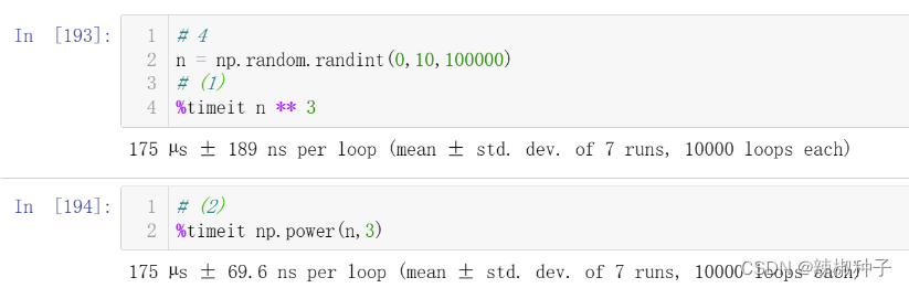 4、创建一个长度为100000的随机数组,使用两种方法求3次方,并比较所用时间