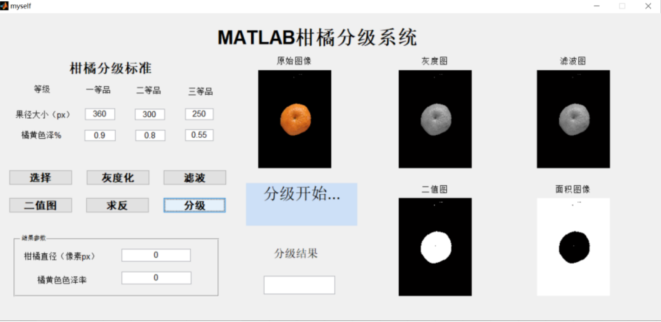 该课题为基于MATLAB的水果分级系统。适用圆形水果,如苹果,橘子,柚子,柿子等,统计水果图片的面积,圆形度和色泽等多参数进行评价。该设计带一个GUI界面,通过设置直径和色泽,测试水果的这些参数,从而得出该水果所属等级。