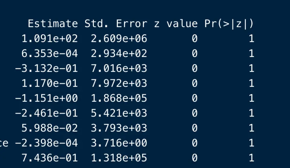 或者在进行logistics回归时候,发现glm方程输出各个变量的p值都是1,z值是0.