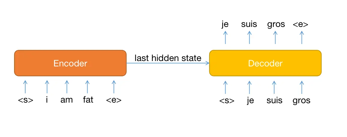 如下图所示,< s > i am fat < e > 为源语句(< s > 、 < e > 分别为首尾符),输入以循环神经网络为基本结构的编码器中,最后一步的 hidden state 可当作整个文本的表征,因为基于循环神经网络的记忆性质,它“见过了”整个文本。而此 hidden state 则作为解码器(也是循环神经网络结构)的 init hidden state,与初始标志符 < s > 一同作为第一步的输出,预测第一步的单词,再将第一步预测的单词作为第二步的输入,依次类推,直至解码至结束符 < e > 或者达到最长长度。