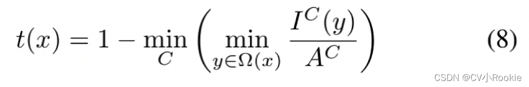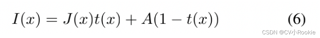 其中 I(x) 是有雾的图像,J(x) 表示场景辐射度(干净的图像)。 A为全球大气光,t(x)为介质透射图,定义为: