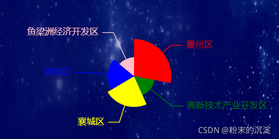 本文探讨如何在图表中确保扇形图的颜色与文字颜色保持一致,通过实例展示了如何配置数据项的样式,如襄州区的红色、高新技术产业开发区的绿色等。