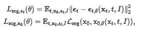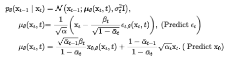 训练过程的公式和 DDPM 基本是保持一致的,下面的公式分别表示反向过程中预测噪声和原图: