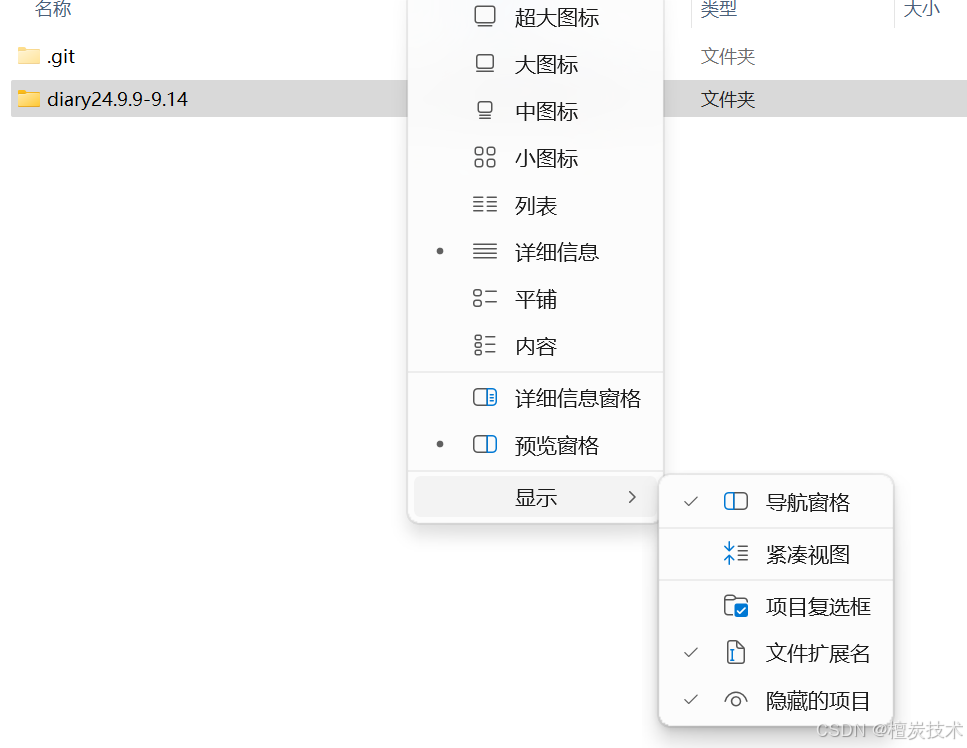 我刚开始是这么想的,其实并不是,记不记得?本地仓库存放的是版本管理数据和git配置的相关信息,但并不是直接存放我们要备份的文件,而是新建一个文件夹把文件和本地仓库放在一块。通常本地仓库是隐藏目录,并不需要我们直接对隐藏目录里的东西进行操作,我们主要是用命令来用git帮助我们管理文件,当然也有一些其他的工具来使用git,包括插件啊、图形用户界面(即GUI)等,这里就不多介绍了,下面主要用电脑自带的命令行工具来使用。虽然工具有所不同,但是了解git如何管理文件才是关键。还有一个新名词叫工作目录,待会会讲到。隐藏目录一般看不到,如果点击下面勾选上“隐藏的项目”就可以看到.git这个隐藏目录,好细心,文件夹颜色竟然还比平时的文件夹淡。