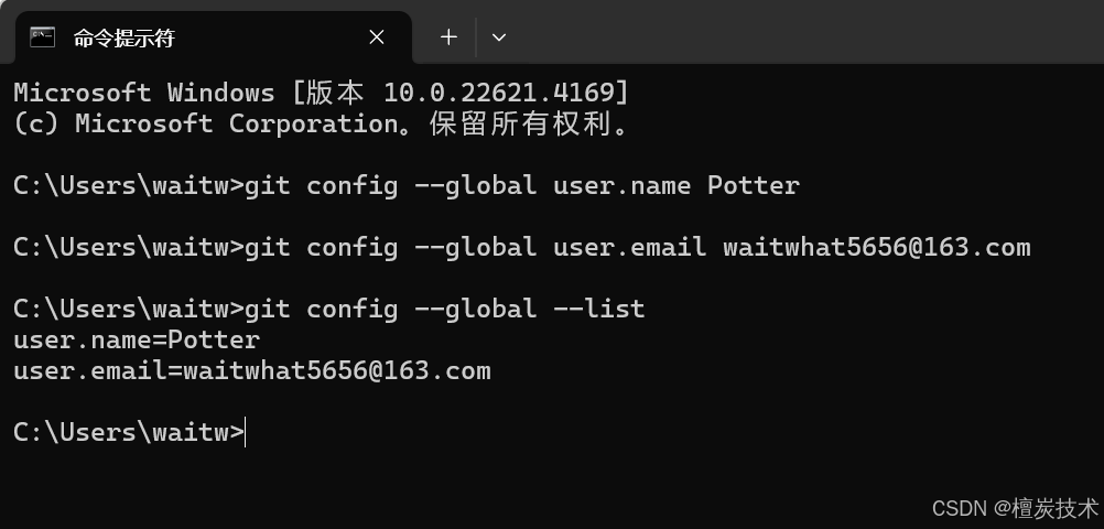 首先先配置一下我们的git,包括配置我们的用户名和邮箱,配置要用到git config —global 这条命令,后面直接跟你的用户名,再来一条同样的命令,后面写上你的邮箱,最后我们可以用git config —global —list 来验证,像下面这样。