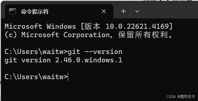 由于在安装的时候通常都会勾选上Git from the command line and also from 3rd-party software这个选项,翻译过来即“”Git 从命令行和第三方软件使用“,所以安装完毕后我们可以通过打开电脑的命令行提示符,具体操作是:打开“开始菜单”→在搜索框中输入“cmd”,这时候就可以在上面输入“git —version”(注:里面是两条短横线,并不是破折号),此时按下回车键,界面会输出类似于git version x.y.z,其中x.y.z是git的版本号,如果 Git 没有安装:会出现 `git: command not found` 或 `git不是内部或外部命令` 的错误消息。我这里显示的就是2.46.0.windows.1