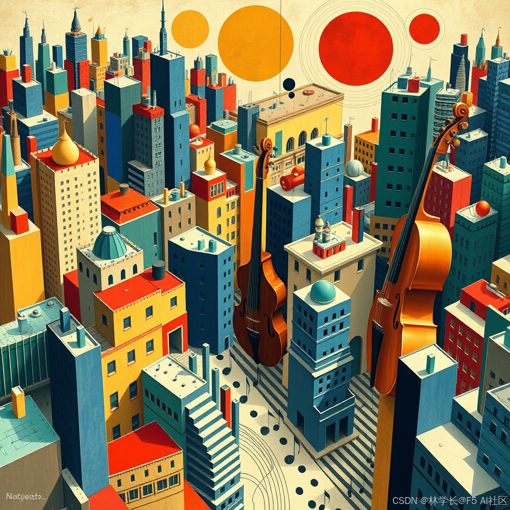 Create an image that fuses the precision of M.C. Escher’s impossible geometries with the bold colors and shapes of Wassily Kandinsky’s abstract compositions. The subject should be a surreal cityscape where buildings seamlessly transform into musical instruments. Use Escher’s techniques to create paradoxical perspectives and interconnected structures, but render them in Kandinsky’s vibrant, non-representational style. Incorporate musical notations and abstract shapes that flow through the scene, connecting the architectural elements. The color palette should be rich and varied, with particular emphasis on deep blues, vibrant reds, and golden yellows.