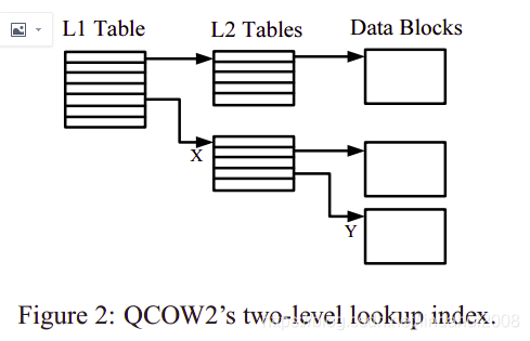虚拟磁盘的数据被拆分为一个个cluster,然后这些cluster用一个二级索引表组织起来,第一级称作L1 Table,第二级称作L2 Table,其组织形式如下所示: