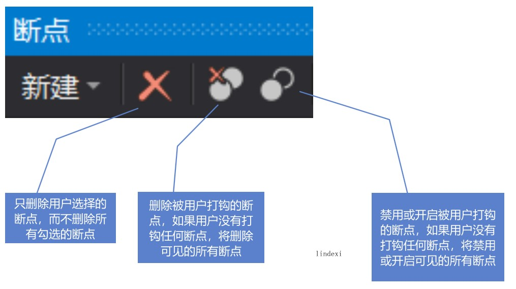另外一个删除按钮是只删除当前选中项,对于被勾选的断点不会被删除,几个按钮的功能请看下图