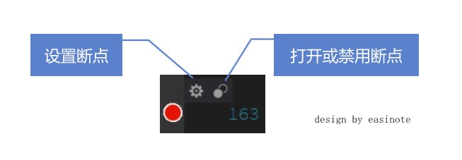 给断点添加条件有两个方法,第一个方法和使用代码行添加断点的方法相同,将鼠标移动到断点上,此时可以看到显示了两个按钮,在上文说到禁用或启动断点的时候用到了右边的按钮,现在给断点添加条件需要用到第一个按钮