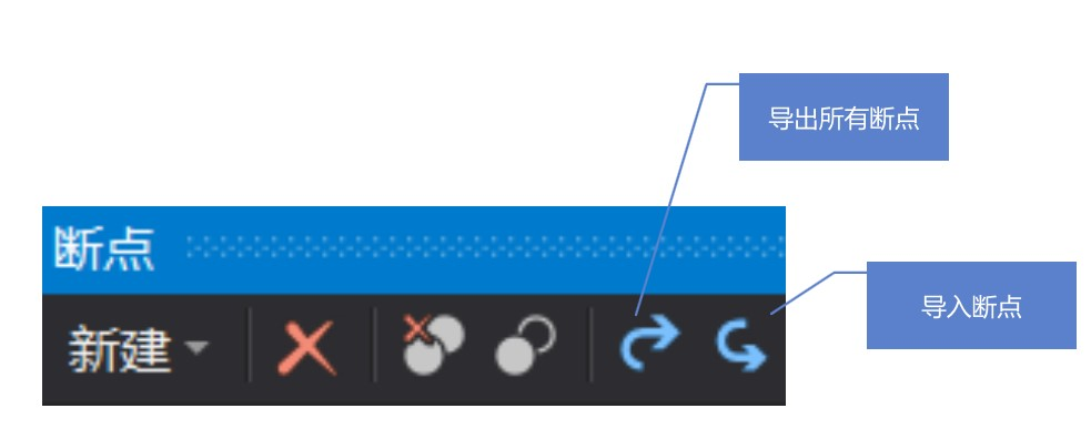 默认会保存在 .vs\**\.suo 文件里面,也就是断点是不随代码仓库提交的,但是我需要将我的断点发送到另一台设备使用?除了复制一个 .vs 文件夹之外,还可以导出断点到文件。在断点窗口提供导出和导入断点的功能,可以通过点击按钮导出当前满足搜寻条件的所有断点,即使你没有对他打钩,或右击某个断点点击导出