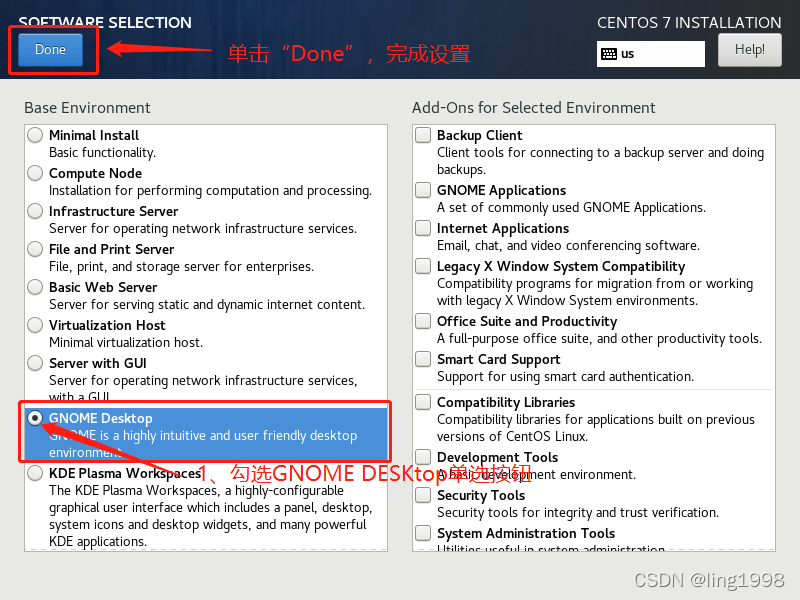 (2)勾选“GNOME Desktop”,点击“Done”