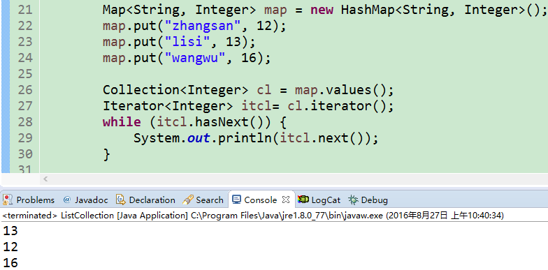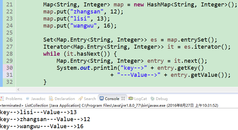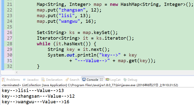 代码的line26-32是对集合的遍历。首先line26:通过Map集合的keyset();方法获取集合中所有的键,这个键获取回来的是一个set的集合,然后在根据set集合的遍历方式去遍历它,逐个获取,最后line30,通过键去获取值,并打印出来。