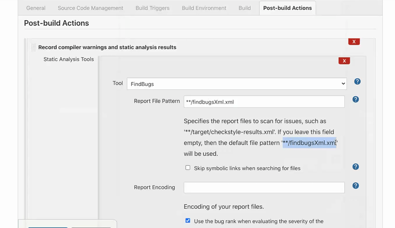 - 在静态工具中选择 FindBugs 在 Report File Pattern 配置上