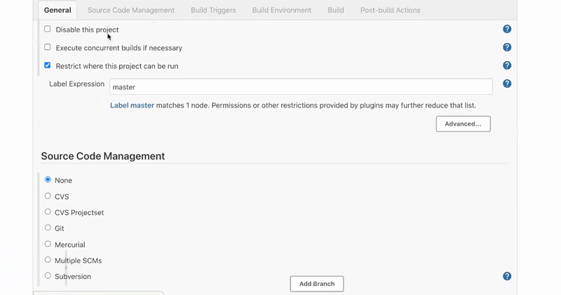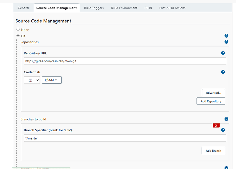 - 配置代码源,将被测项目代码的 git 地址配置到此处。