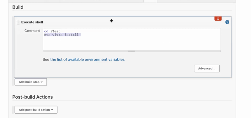 - 在构建(Build)中点击增加构建步骤(Add build step),构建步骤中选择执行 shell(Execute shell)。