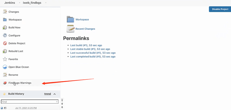- 点击执行后,job 将会拉取代码进行静态扫描操作,执行完成之后在 job 的首页左下部分有一个 FindBugs Warnings的按钮。
