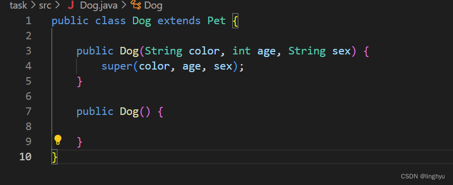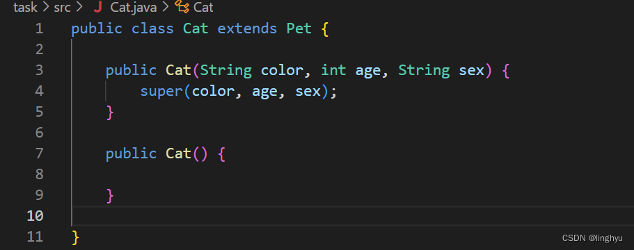 以Pet为父类,定义子类Cat、Dog,使用super关键字访问父类Pet成员;