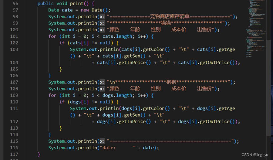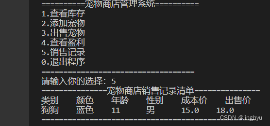+ pets[i].getSex() + "\t" + pets[i].getInPrice() + "\t" + pets[i].getOutPrice());