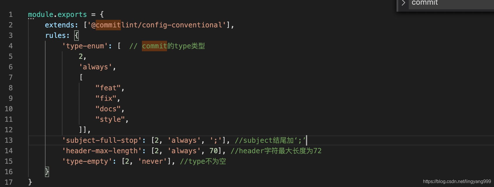 在文件中直接配置:module.exports = {extends: ['@commitlint/config-angular']};