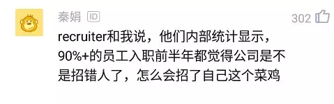 有网友表示:recruiter(招聘人员)之前和我说过,他们内部统计显示,90%多的员工入职后的前半年都会感觉到公司是不是找错人了?怎么会招了自己这个菜鸡?