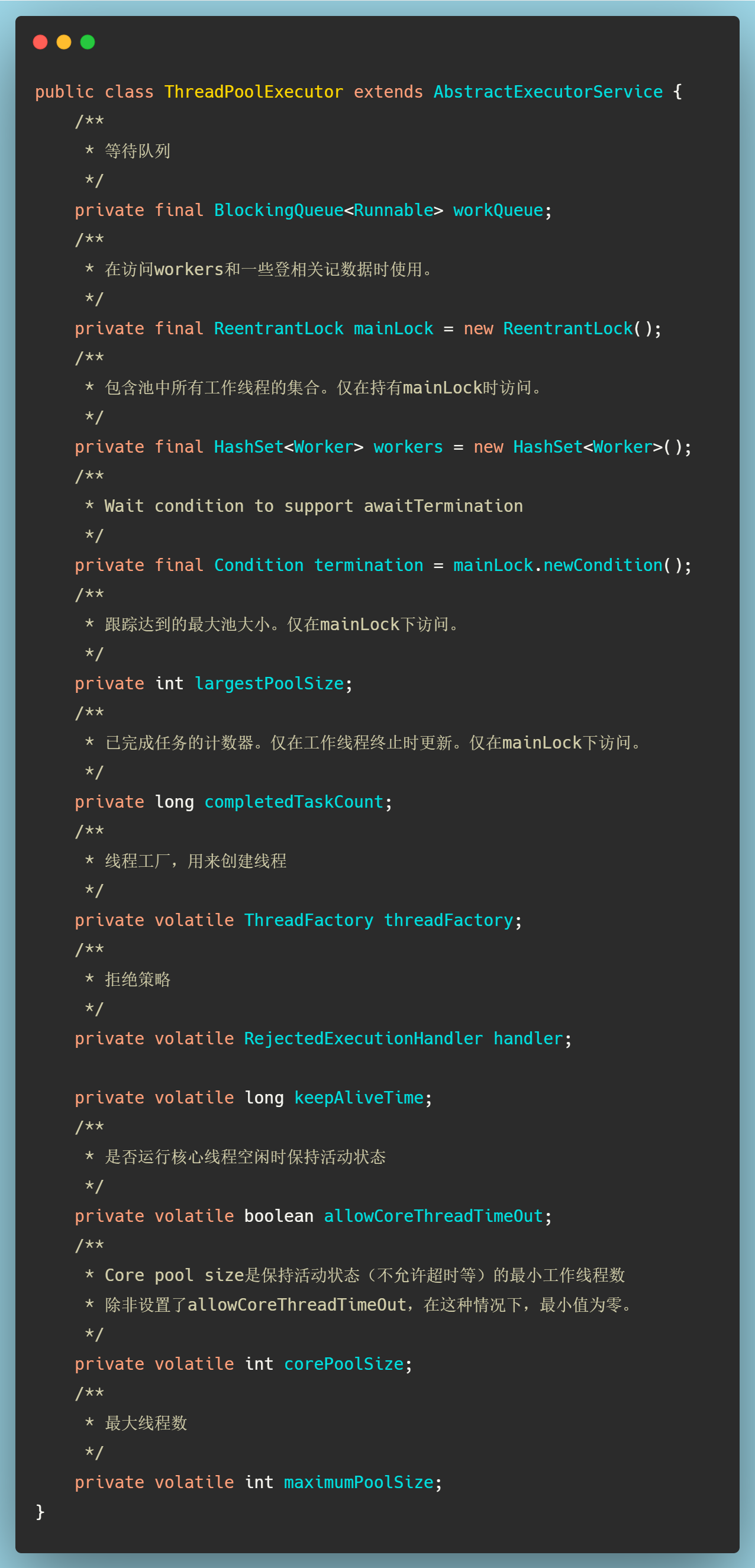 在这之前我们需要先知道ThreadPoolExecutor中一些比较重要的变量,可点开下图查看。