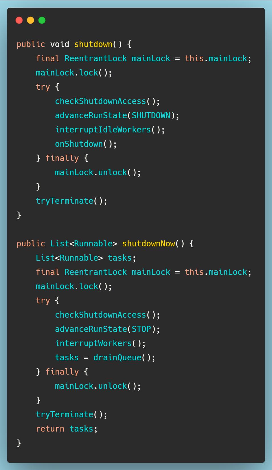 ThreadPoolExecutor中有两个方法可以让线程池关闭,如下: