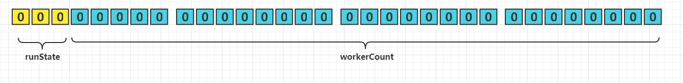 我们看到在最上面有定义一个AtomicInteger ctl这样一个原子类型的Integer,这个ctl不光可以表示线程池的运行状态,同时能够表示线程池的有效线程数workerCount。那么是怎么做到的呢?我们都知道Integer类型的内存大小是4个字节,对应32个bit,ctl将32位的高三位用来表示线程池的运行状态,低29位表示有效线程数。